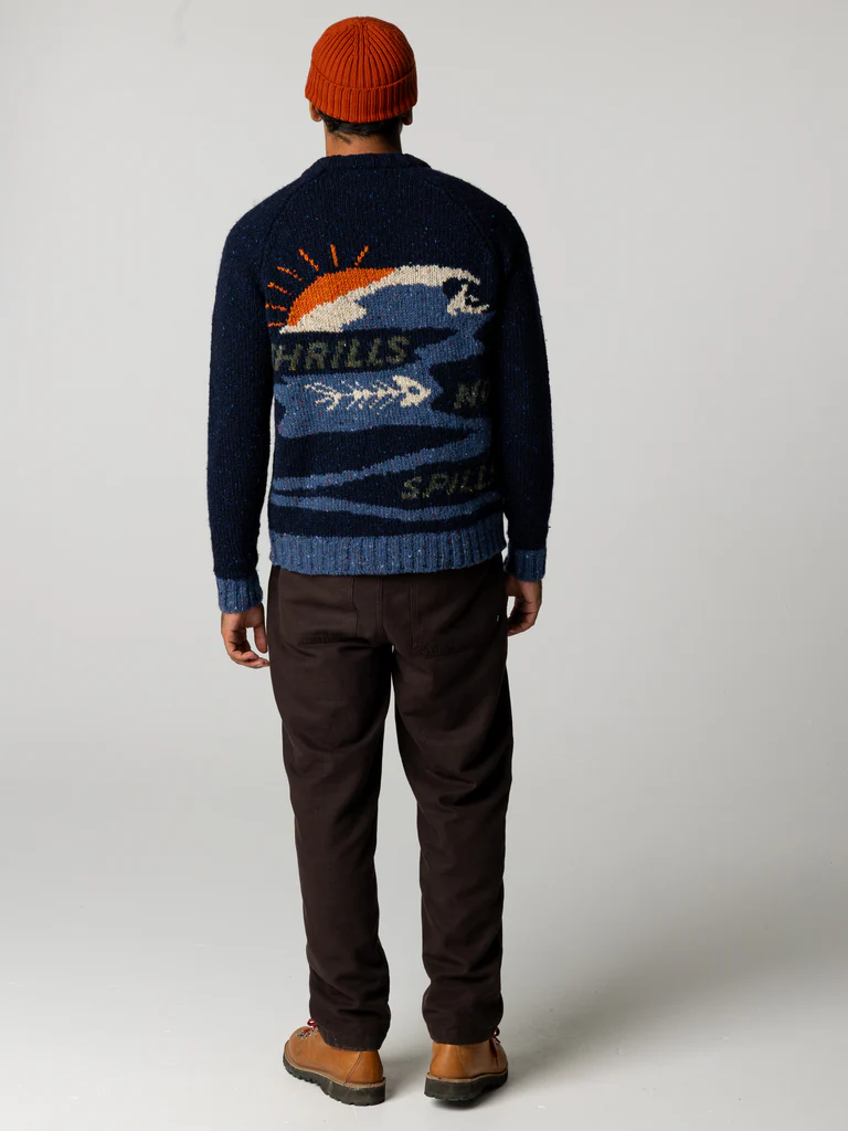 Finally, a jumper that lets you signal your eco-consciousness while looking seriously cozy. The Finisterre Thrills Not Spills Crew Knit (£250) is the ultimate chunky knit for the man who believes in soft Kilkarra wool and protecting the ocean. This relaxed-fit jumper, with its hand-knitted feel, boldly displays a surfer riding a huge wave—sadly, right next to an oil spill. It’s a stylish, intarsia-knitted reminder that we, as surfers and humans, need to clean up our act. It’s basically a billboard for responsibility that you can wear straight to the pub. Warning: may prompt conversations about marine conservation. But hey, at least you’ll be the warmest person arguing about carbon footprints.