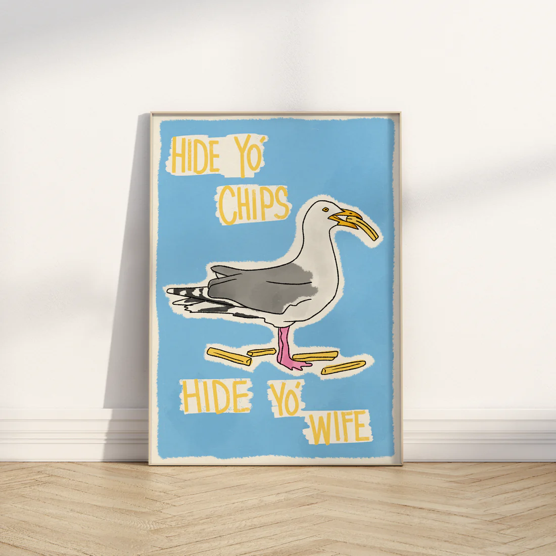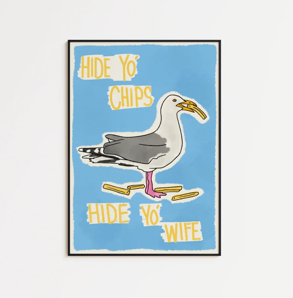 Gentlemen, if your walls are currently suffering from a severe case of “beige blandness” or “motivational poster malaise,” it’s time for an intervention. May we present the Danny Issues Seagull ‘Hide Yo Chips’ Print (£22), a masterpiece of avian mischief that will undoubtedly spark joy (and perhaps a craving for fish and chips).