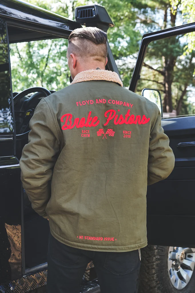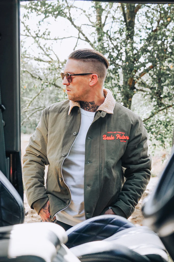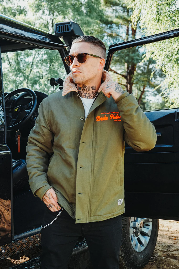 The full sherpa lining, including the sleeves, means you’ll be cosier than a badger in a burrow. Decked out with a fully embroidered “Broke Pistons Race Crew” design (even if your most daring race involves getting to the coffee machine before Brenda), this heavyweight 17oz cotton canvas jacket, inspired by the WWII USN type N1, is built to endure. It’s even slightly longer, so your lower back won’t catch a chill mid-ride (or mid-Netflix binge). Available in Olive Green and Black, pair it with dark jeans and boots for that “just wrestled a kraken” vintage vibe.