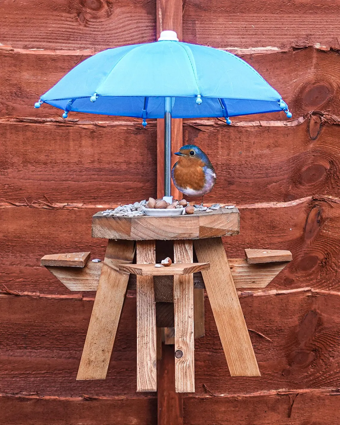 It even boasts a retractable umbrella, presumably for those birds who prefer a little shade while they brunch. Two ceramic bowls are included for their gourmet seed and water selection. Attaching easily to a fence post, this charmingly absurd creation is handcrafted with care, ensuring a durable and aesthetically pleasing addition to your garden. Now, if only it came with tiny bird-sized napkins.