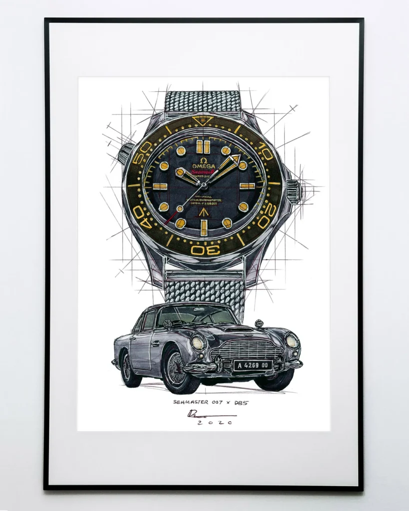 Introducing the Omega Seamaster 300M & James Bond’s Aston Martin Watch Drawing, a piece of pure, unadulterated cool for just $99. Created by the talented artist Ben Li, who has collaborated with giants like Jaeger-LeCoultre and IWC, this isn’t just a drawing; it’s a love letter to two cinematic icons. Ben has brilliantly combined the Omega Seamaster 300M worn by Daniel Craig as James Bond with the legendary Aston Martin DB5.