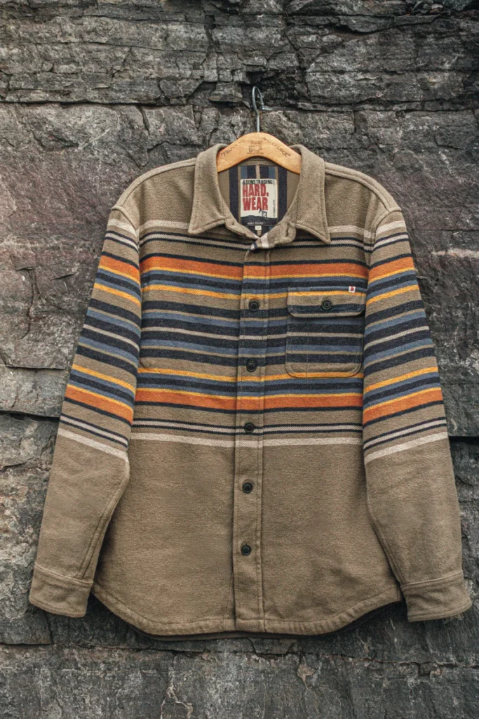 Built from substantial 350gsm cotton, this shirt sits in that perfect, confusing space between a jacket and a flannel. Its relaxed cut is ideal for layering over whatever questionable t-shirt you wore this morning. The bespoke yarn-dyed stripe uses warm fawn tones broken up by a bolt of orange, ensuring character without shouting. Thoughtful details abound, including a carpenter’s pencil slot (for actual work or highly pretentious sketching) and Corozo buttons. Garment-washed for instant, lived-in softness, it’s ready to become the dependable cornerstone of your winter kit.